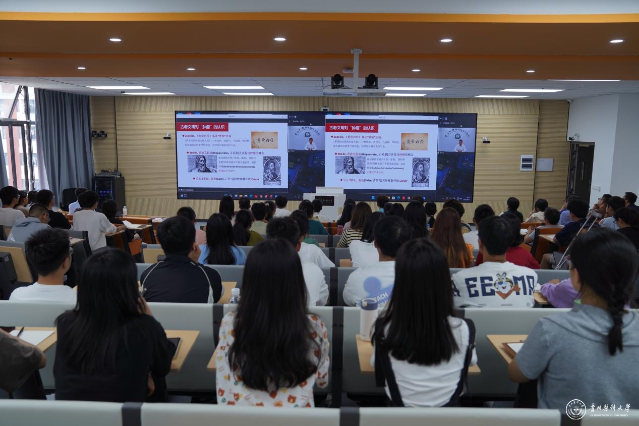 9月27日,beat365师生通过“贵医云”智慧教育平台,以线上+线下同步课堂形式,在云漫湖校区的46间教室里共同聆听由中山大学医学部主任、中国科学院院士宋尔卫讲授《肿瘤生态学》第一讲肿瘤生态学概论。