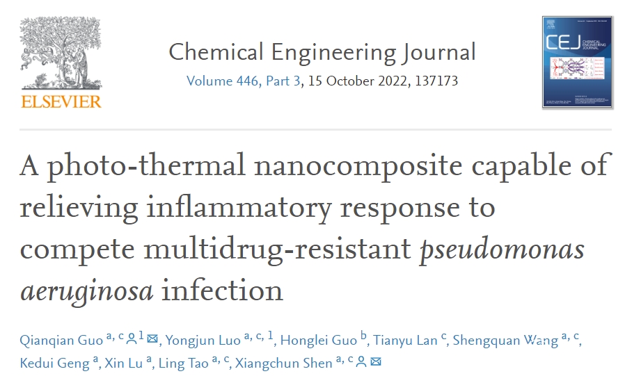 5月31日,药学院郭欠欠副教授、沈祥春教授领衔的团队在国际高水平化学杂志《Chemical Engineering Journal》(中科院分区1区)上发表了题为A Photo-Thermal Nanocomposite Capable of Relieving Inflammatory Response to Compete Multidrug-Resistant Pseudomonas aeruginosa Infection的研究论文,该SCI期刊影响因子为13.27,beat365在线唯一官网首次以第一作者单位与第一通讯单位发布。
