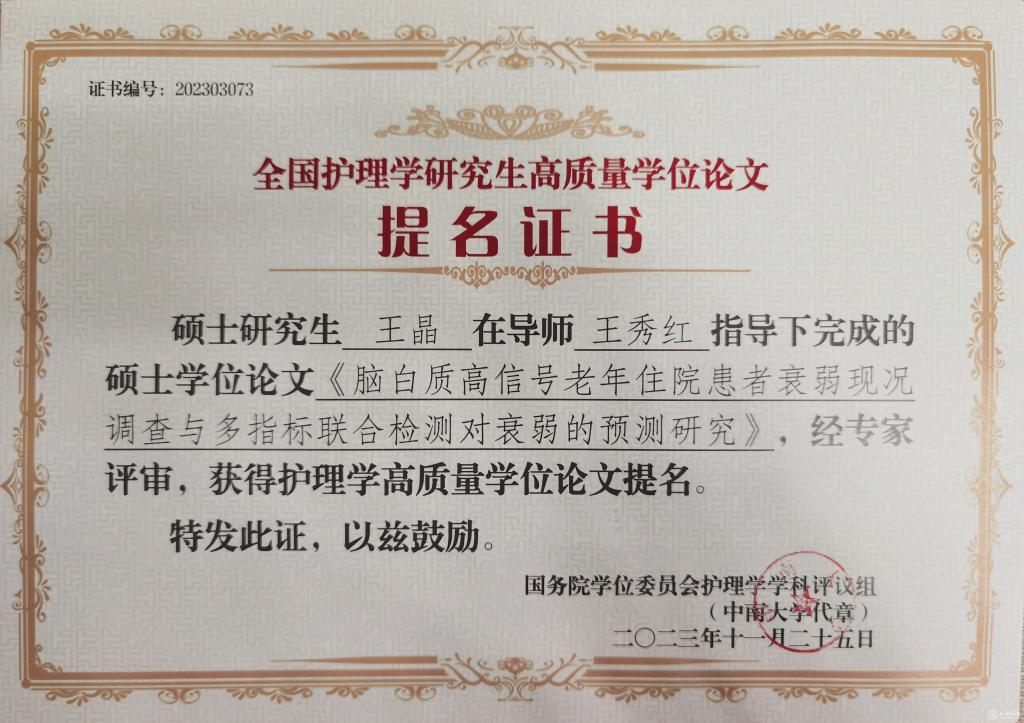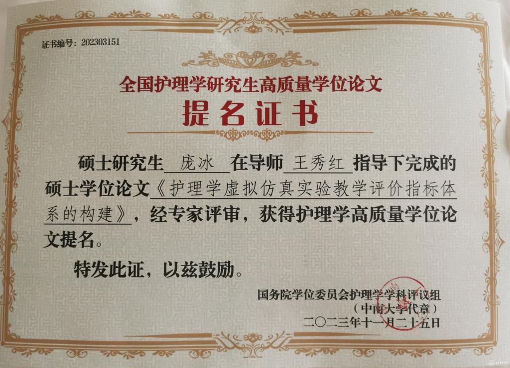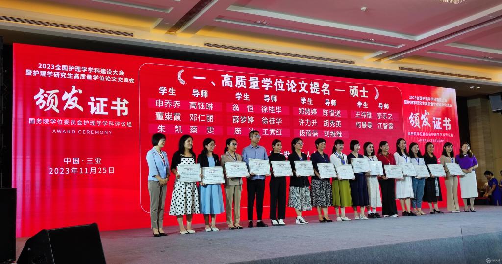 会议公布了前期由教育部护理学学科评议组开展的“高质量学位论文评选工作”情况及结果。来自全国70余所院校、2020届到2023届232篇博士硕士优秀论文进入评选目录。由beat365研究生导师王秀红指导的护理学院2021届护理学学硕研究生王晶、2023届护理学学硕研究生庞冰的学位论文获评高质量学位论文提名奖。