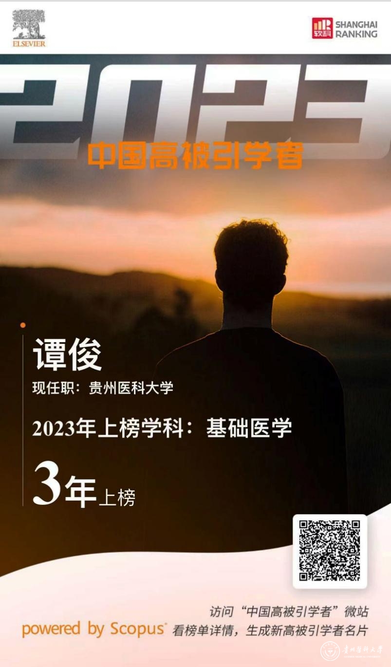 3月27日,爱思唯尔 (Elsevier) 重磅发布2023“中国高被引学者” (Highly Cited Chinese Researchers) 榜单。地方病及少数民族疾病教育部重点实验室/贵州省分子生物学重点实验室谭俊教授连续三年入选基础医学领域 “中国高被引学者”榜单。爱思唯尔发布“中国高被引学者”榜单, 不仅致力于系统性地展示中国科研领域的人才分布现状,而且精准呈现各机构、高校优势学科构成及学术影响力,以及在关键技术研究和各重点领域的顶尖人才。