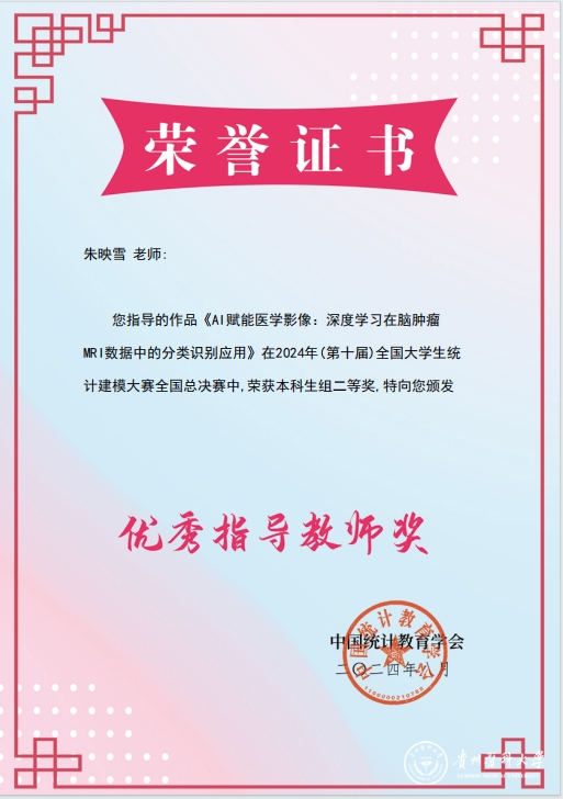 在2024年第十届全国大学生统计建模大赛中,beat365共组织43支队伍参赛,20支参赛队获奖,其中,1支参赛队荣获国家级本科组二等奖,4支参赛队获得贵州赛区本科组一等奖,6支参赛队获得贵州赛区本科组二等奖,9支参赛队获得贵州赛区本科组三等奖。