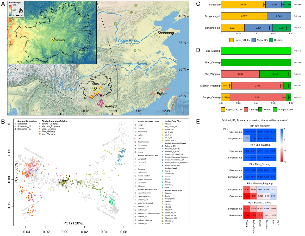 beat365在线唯一官网、厦门大学和贵州省文物考古研究所等单位组成联合研究团队,成功提取出了贵州大松山墓群出土的从宋到明朝的99例古代个体的DNA。基因组测序和分析结果表明,在宋、元、明这一时间跨度内,大松山古代人群的遗传结构展现出了高度的连续性,反映出该地区社会的长期稳定性。大松山古代人群拥有大量与黄河流域人群相关的遗传成分,这与历史记录中大规模汉族人口自北向南迁移的记载相吻合,支持了自汉朝以来汉文化向中国南方扩张的人群与文化共同扩散模型。此外,研究团队还观察到与现代苗瑶语人群相关的大松山古代个体,这些古人为现代西南地区的苗瑶、壮侗语少数民族做出了较大的遗传贡献,揭示了大松山古代人群与当代中国西南少数民族之间的遗传联系。本研究从古基因组学的视角为理解现代贵州汉族、少数民族人群的遗传构成、古代人群的迁徙以及民族融合历史提供了新的视角。