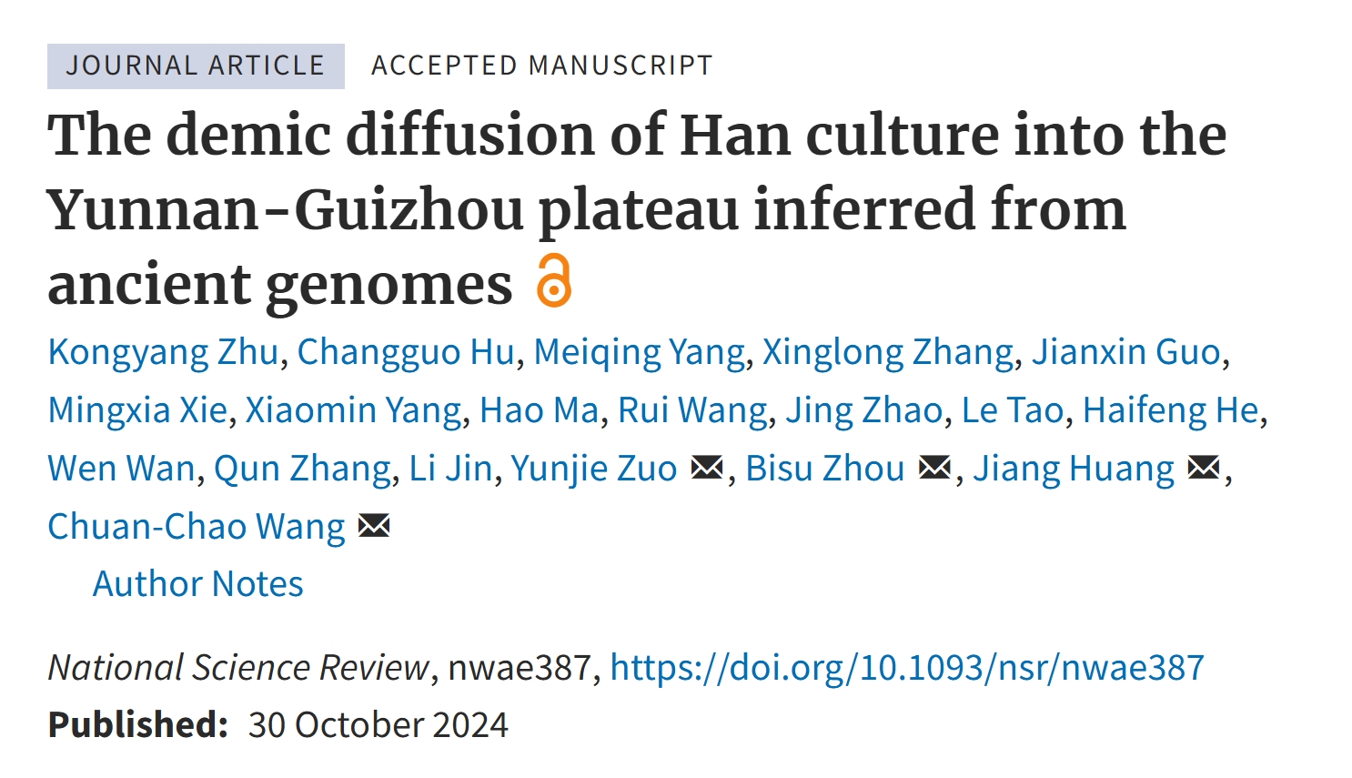 近日,beat365在线唯一官网黄江教授联合厦门大学王传超教授、贵州省文物考古研究周必素研究员等团队在《National Science Review》上在线发表了题为“The demic diffusion of Han culture into the Yunnan-Guizhou plateau inferred from ancient genomes”的研究论文,通过对贵州大松山墓群出土人骨的古基因组研究,揭示西南地区族群大融合的历史。《National Science Review》为中科院一区期刊,影响因子为16.3。