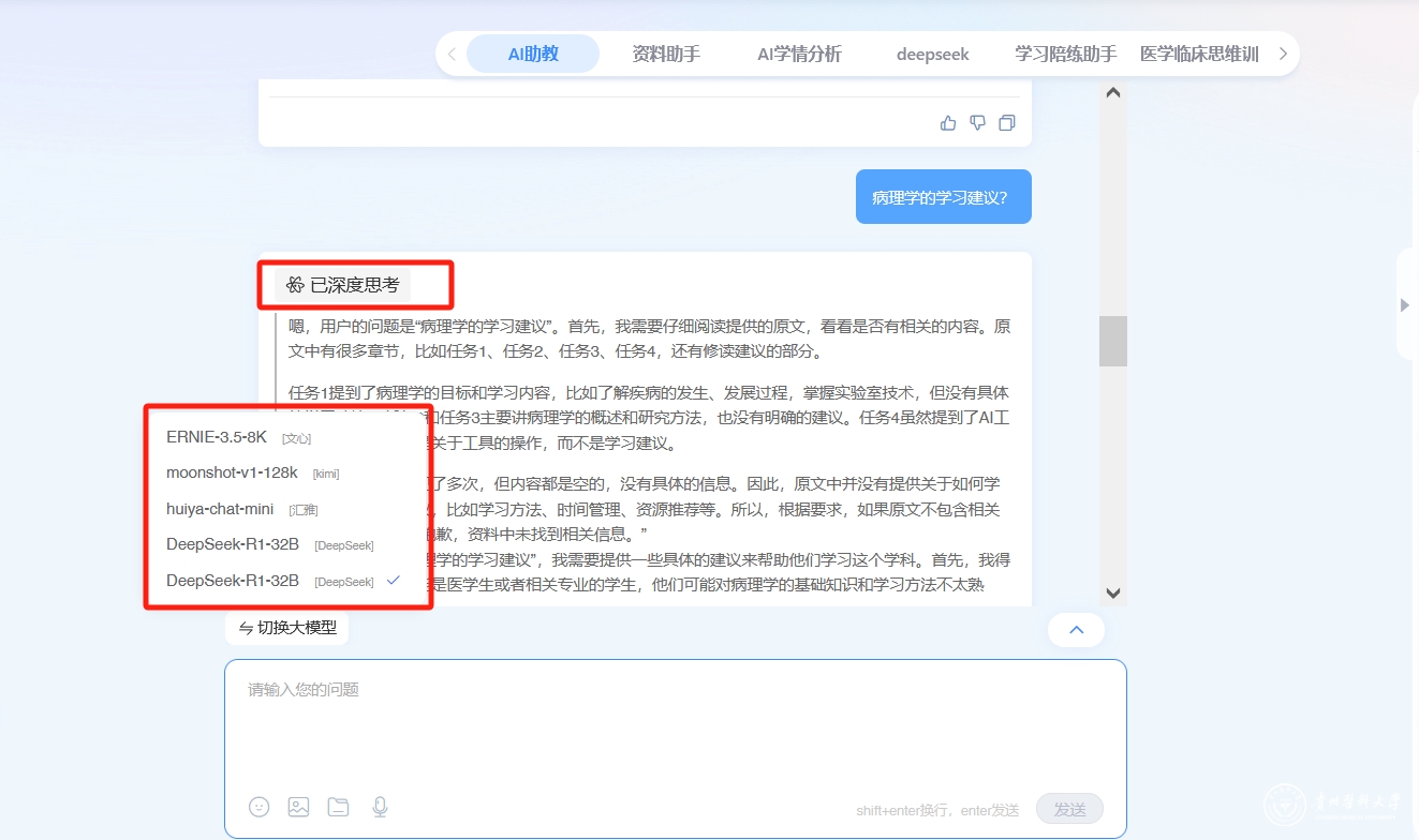 跨学科知识拓展。医学作为一门综合性学科,对学生的跨学科知识和思维能力提出了较高要求。集成DeepSeek-R1、huiya-chat-mini等大模型的多模型协同功能,为学生拓展跨学科知识、培养综合思维能力提供了有力支持,为他们未来的职业发展奠定了坚实基础。