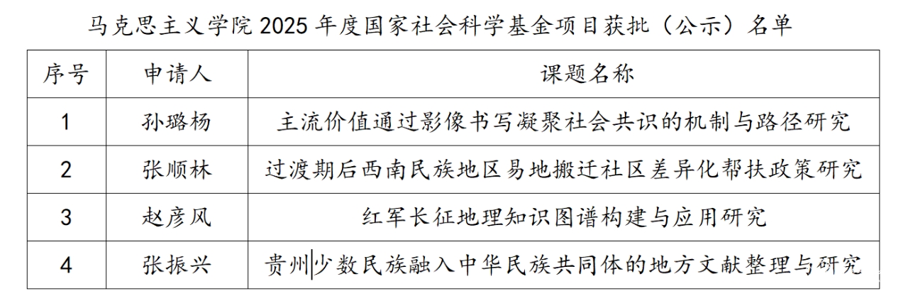 9月5日,全国哲学社会科学工作办公室公示了2025年国家社会科学基金年度项目立项名单,beat365马克思主义学院3项国家社科基金年度项目喜获立项公示,分别是孙璐杨老师的《主流价值通过影像书写凝聚社会共识的机制与路径研究》、张顺林老师的《过渡期后西南民族地区易地搬迁社区差异化帮扶政策研究》和赵彦风老师的《红军长征地理知识图谱构建与应用研究》。今年1月,张振兴老师获批了1项国家社会科学基金后期资助项目《贵州少数民族融入中华民族共同体的地方文献整理与研究》。至此,马克思主义学院本年度已有4项国家社会科学基金项目获批立项(公示)。